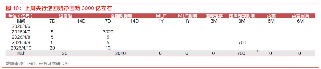 上周公开市场操作净回笼3705亿。上周逆回购单日投放维持极低水平,合计投放35亿低位,净回笼3000亿左右;叠加买断式回购到期11000亿,投放8000亿,净回笼3000亿;以及国库定存到期700亿,上周公开市场操作净回笼3705亿。