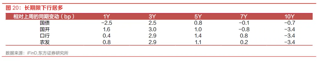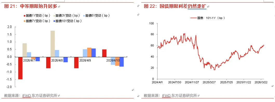 上周,中东局势缓和风险偏好回暖,权益市场大涨;不过债市受益于资金仍然宽松、3月CPI不及预期、市场预期超长特别国债发行期限可能缩短等利多因素,长端情绪较好,曲线压平。最终10Y国债、国开活跃券较上周分别变动-0.8、-1.9bp至1.81%、1.94%。收益率方面,最终1年期、3年期、5年期、7年期、10年期中债国债到期收益率分别较前周变动-2.5、2.5、0.8、-0.1、-0.7bp至1.21%、1.36%、1.55%、1.68%、1.81%。利率变动存在一定分化,中短期限抬升居多,3Y国开抬升3bp,幅度最大;长期限下行居多,10Y各类政金债收益率下行3.4bp。