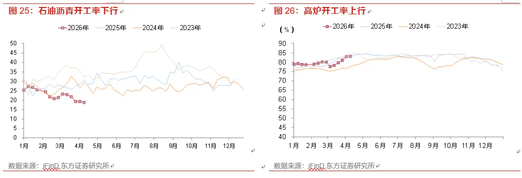 生产端,开工率多下行。高炉开工率从83.1%上行至83.2%,半钢胎开工率从77.7%下行至76.3%; PTA开工率自81.2%下行至78.5%;沥青开工率自19.3%下行至18.8%。3月下旬日均粗钢产量同比降幅收窄,读数-4.1%。