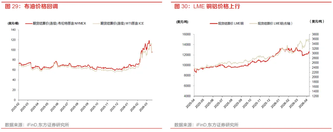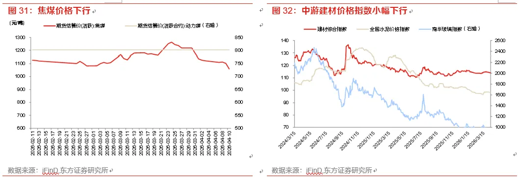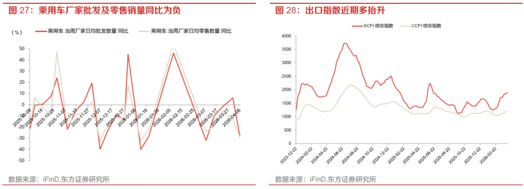 需求端,4月初乘用车厂家批发及厂家零售同比为负。4月6日当周,乘用车厂家批发同比变动-28%,厂家零售同比变动-29%。4月5日当周,百大中城市土地成交面积抬升至661万平,同比出现较大降幅,4月5日30大中城市商品房销售面积下行至296附近,但较去年同期抬升。出口指数方面,SCFI、CCFI综合指数分别变动1.9%、2.1%。