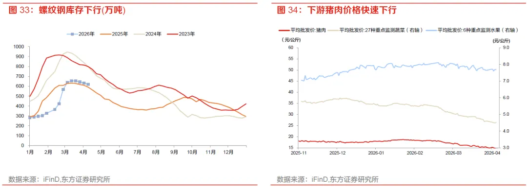 价格端,布油价格向下,最终上游布伦特期货原油价格、WTI期货原油价格分别变动-12.7%、-13.4%;铜铝价格抬升,LME铜、LME铝分别变动4.2%、0.6%;煤炭价格分化,动力煤活跃合约期货结算价与上周持平,焦煤活跃合约期货结算价变动-5.6%。中游方面,建材综合价格指数小幅下行,水泥指数变动-0.3%,玻璃指数变动-4.3%。螺纹钢产量上行,库存下滑但去库速度仍慢,目前库存在620万吨,期货价格变动-0.2%。下游消费端,蔬菜、水果、猪肉价格分别变动-1.7%、0.4%、-2.6%。