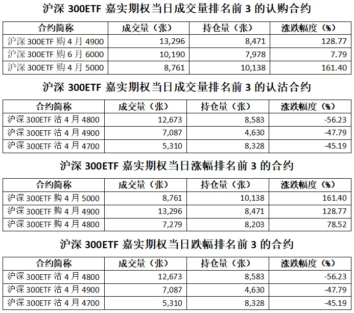 沪深300ETF嘉实期权总成交面额62.64亿元,增加45.80%,期现成交比为0.01,权利金成交额0.52亿元;期权总成交量123,904张,增加41.41%,其中认购期权成交量78,520张,认沽期权成交量45,384张,认沽认购成交比率为0.58(上一交易日认沽认购成交比率为0.88)。