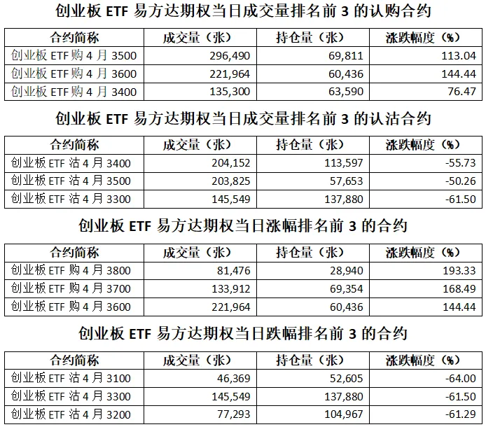 创业板ETF易方达期权总成交面额812.74亿元,增加44.84%,期现成交比为0.29,权利金成交额14.24亿元;期权总成交量2,369,111张,增加43.21%,其中认购期权成交量1,268,033张,认沽期权成交量1,101,078张,认沽认购成交比率为0.87(上一交易日认沽认购成交比率为0.82)。