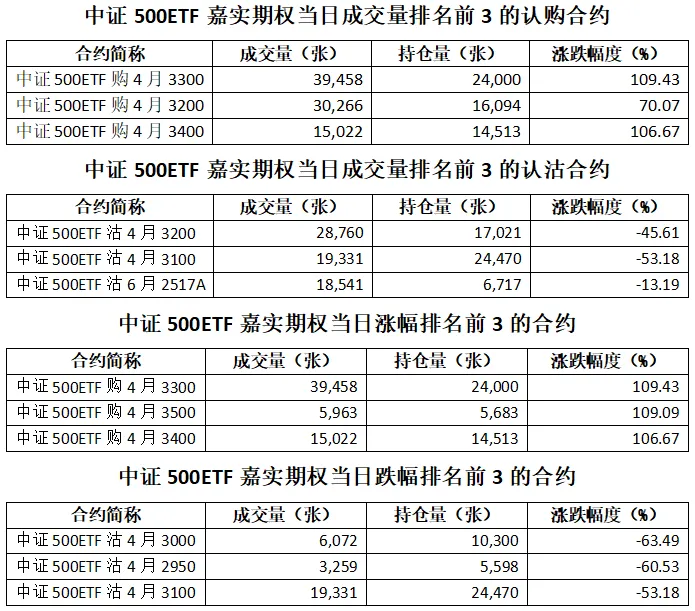 中证500ETF嘉实期权总成交面额83.98亿元,增加40.35%,期现成交比为0.02,权利金成交额0.98亿元;期权总成交量260,204张,增加40.72%,其中认购期权成交量151,138张,认沽期权成交量109,066张,认沽认购成交比率为0.72(上一交易日认沽认购成交比率为0.82)。