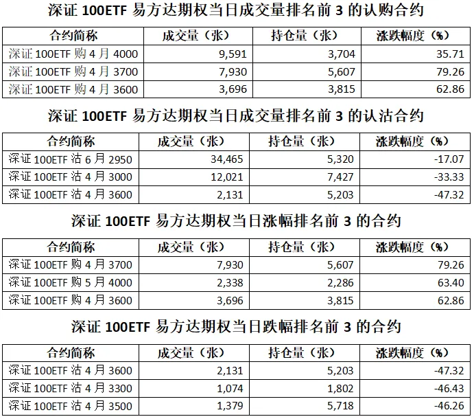 深证100ETF易方达期权总成交面额32.02亿元,增加38.90%,期现成交比为0.01,权利金成交额0.34亿元;期权总成交量95,849张,增加42.10%,其中认购期权成交量36,573张,认沽期权成交量59,276张,认沽认购成交比率为1.62(上一交易日认沽认购成交比率为1.21)。