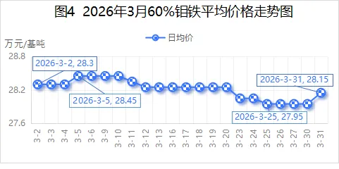 2026年3月,国内60%钼铁均价28.22万元/基吨,较2026年2月27.09万元/基吨,环比增长4.17%;较2025年3月21.89万元/基吨,同比增长28.92%。