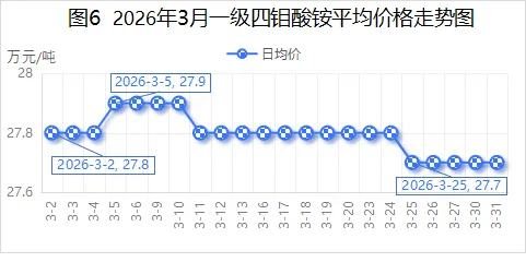 2026年3月,国内一级四钼酸铵均价27.8万元/吨,较2026年2月26.29万元/吨,环比增长5.74%;较2025年3月21.1万元/吨,同比增长31.75%。