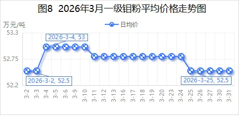 2026年3月,国内一级钼粉均价52.75万元/吨,较2026年2月50.23万元/吨,环比增长5.02%;较2025年3月40万元/吨,同比增长31.88%。