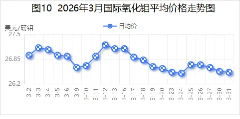 2026年3月,国际氧化钼均价26.81美元/磅钼,较2026年2月26.94美元/磅钼,环比减少0.48%;较2025年3月20.13美元/磅钼,同比增长33.18%。