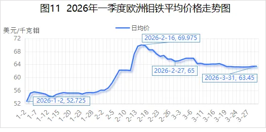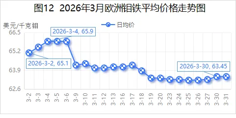 2026年3月,欧洲钼铁均价为64.14美元/千克钼,较2026年2月64.53美元/千克钼,环比减少0.6%;较2025年3月48.79美元/千克钼,同比增长31.46%。