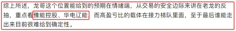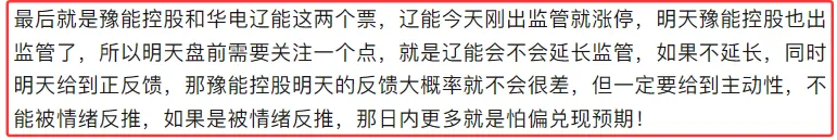 来源于公众号文章截图,仅供参考与交流,不构成任何投资建议,决策依据或交易引导。据此操作风险自负,股市有风险,投资需谨慎。前天的复盘我们给到了最核心的两只的票:华电辽能、豫能控股,截止到今天,两只票的反馈都是完全符合预期的。部分成功案例有片面性、不代表所有,过往涨幅不预示未来,投资者需自主判断,风险自担。很多老铁肯定又会感觉到迷茫了,为什么今天辽能可以连板,而豫能控股不能连板,其实这点龙哥在昨天的尾盘就已经特别强调过,只是今天市场继续选择了让辽能去试探监管的态度。来源于公众号文章截图,仅供参考与交流,不构成任何投资建议,决策依据或交易引导。据此操作风险自负,股市有风险,投资需谨慎。如果明天盘前辽能继续不被监管,那短线情绪接下来就继续看多,因为这代表监管在放松,那这对短线情绪是很大的正反馈。回想这波短线之所以难做,本质上就是1月中旬的监管,当时的利欧卡住了100%的异动,结果也被威胁停牌。至那之后,短线这边的情绪投机就一直被这只无形的手所压制,所以这个位置监管的放松会让短线资金重拾做多的信心于勇气!上面讲的这是外力因素,市场的演绎还有内因,就是市场风格的强化,赚钱效应的强化,这也是前面我们一直在讲的一点。目前来看趋势端的主线在科技这边的AI硬件,而核心方向是光通信,核心标的是:易中天、东山精密。部分成功案例有片面性、不代表所有,过往涨幅不预示未来,投资者需自主判断,风险自担。从今天的反馈来看,给到的是分歧预期,正常来讲,明天大概率是延续分歧,这是对整个板块的预期。另外日内走强的是存储,昨晚美股存储大涨,今天我们这边指数继续给到正反馈的情况下,这种映射效应日内就被强化了,板块内的前排核心就锚定德明利、佰维存储。部分成功案例有片面性、不代表所有,过往涨幅不预示未来,投资者需自主判断,风险自担。但趋势端整体偏轮动,特别是在尾盘的时候,宁德时代的拉升更是带动锂电这边方向的集体异动,板块内的前排核心目前锚定圣阳股份、泰金新能。部分成功案例有片面性、不代表所有,过往涨幅不预示未来,投资者需自主判断,风险自担。目前来看,市场的定价权依旧在机构这边,但这个位置需要重点关注指数的预期,主观认为接下来会给到调整预期,所以风格上在经历分歧之后,很可能往情绪端切换。接下来两天先看分歧,这两天都没敢上车的老铁,接下来还想着追高的一定要注意盈亏比,或者说风险。部分成功案例有片面性、不代表所有,过往涨幅不预示未来,投资者需自主判断,风险自担。龙哥这里能给到的建议是,如果辽能不被延长监管,明天可以看看豫能有没有低吸机会,包括星辉环材的分歧都是可以考虑的。记得点上“星标”,这样就可以第一时间收到平台的推送。