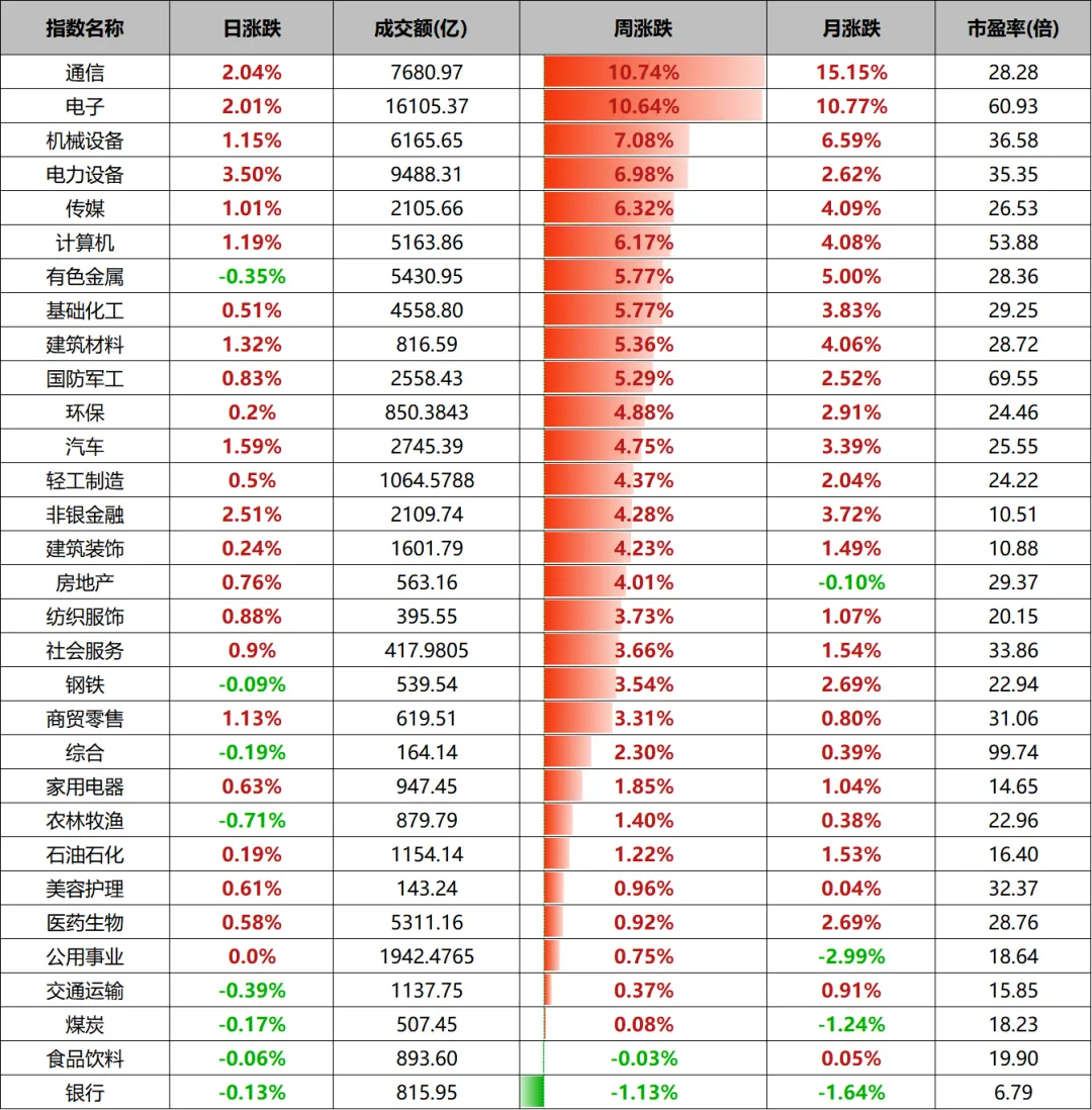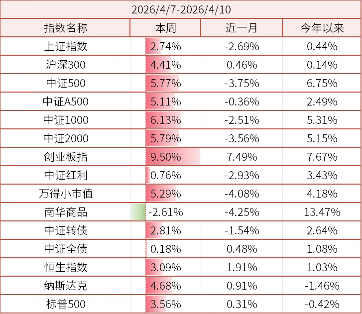 本周(4.7-4.10)市场反弹回升,主要股指涨多跌少,科创风格相对占优。周内受美伊短暂停火风险偏好迅速回升影响,成长风格修复明显,资金情绪缓和,市场日成交额回升至2万亿,上证一度重回4000点。此外,目前也是业绩报密集披露期,一些有业绩修复预期的板块也迎来估值修复。展望后市,美伊谈判失败后A股面临的外部风险仍较大,不排除资金获利了结行为加强。但随着美伊局势时间的不断拉长,其对资产价格影响也在不断减弱,关注景气度较高业绩修复预期较强的板块。