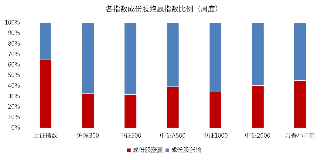 本周宽基指数普涨,量化策略绝对收益随之上行明显,但超额表现内部有分化,中小盘超额相对较强。涨跌表现上看,全市场将近90%的股票实现上涨,但由于资金风格整体偏向成长类中小盘,大盘内部涨赢比例相对较低。