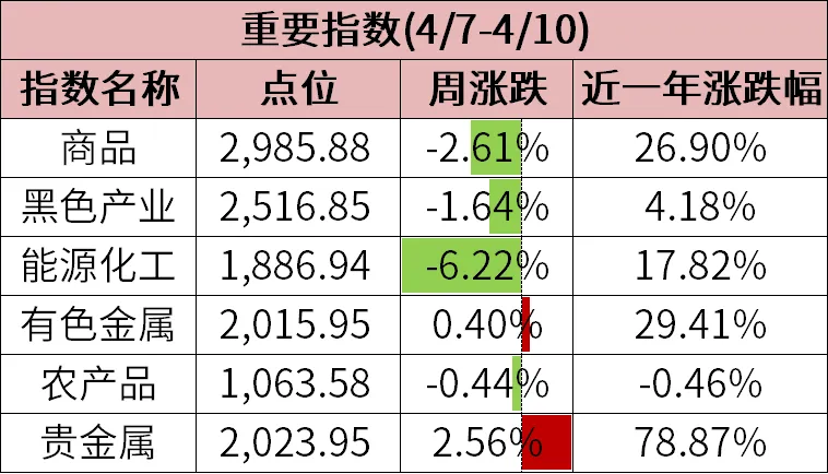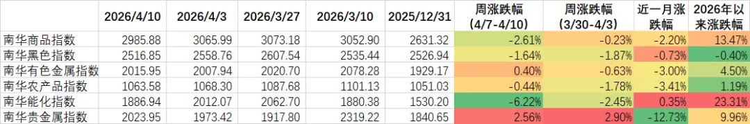 4月7-4月10日,南华商品指数-2.61%(周度趋势延续),细分指数中,黑色指数(-1.64%)、农产品(-0.44%)、能化(-6.22%)、贵金属(2.56%)趋势延续;有色金属(0.4%)趋势反转。