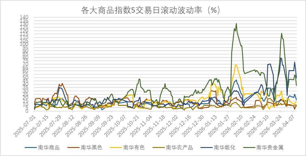 2)波动率角度,5交易日滚动波动率角度,南华商品指数、能化、贵金属在相对高位,黑色、农产品指数波动率在10%以内,有色金属指数在10-15%之间。