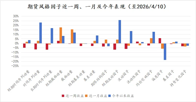 3)因子方面,本周期货风格因子多数下跌,仅有短期截面动量(2.69%)、流动性因子(2.08%)、偏度因子(5.9%)为正收益,负收益的因子中时间序列动量、短期时间序列动量、长期时间序列动量、波动因子、短期波动因子超-4%+。