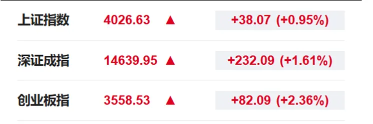 今日上证指数上涨38.07点,收4026.63点。深证指数上涨232.09点,收14639.95点。创业板指上涨82.09点,收3558.53点。分时图看上证指数早盘高开高走,全天指数震荡上行,两市成交2.3837万亿,与上交易日比增加。