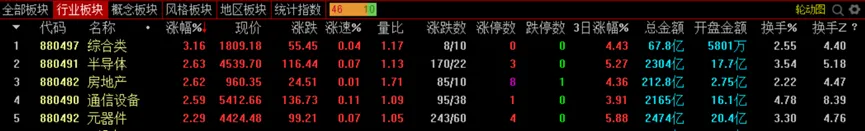 行业涨幅前五的:综合类、半导体、房地产、通信设备、元器件