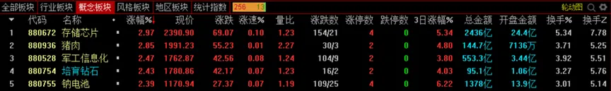 概念涨幅前五的:存储芯片、猪肉、军工信息化、培育钻石、钠电池