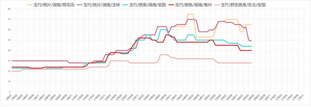 玉竹行情平淡,产区来货有量,市场目前货源供应充足,商家按需采购,行情比较平淡,现湖南统片价格在49-50元左右,今年在地面积较大