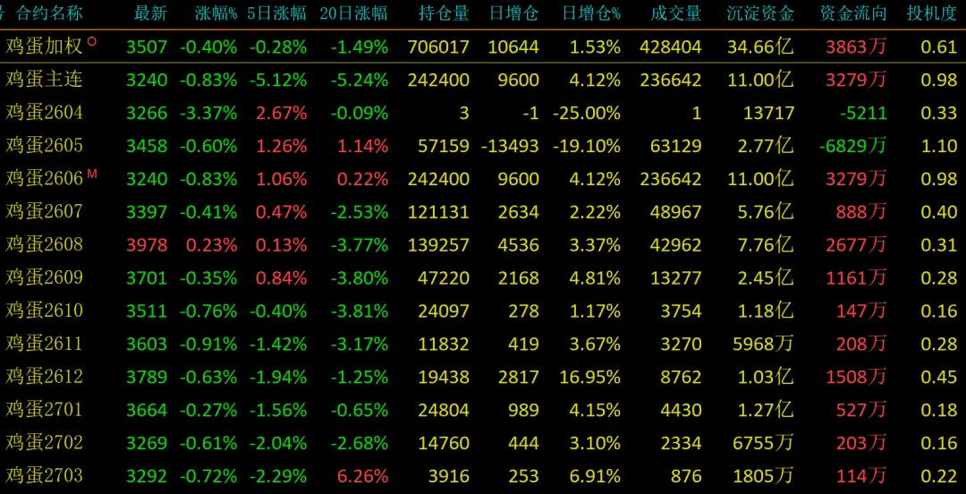 鸡蛋2605:收盘3458(156元),持仓57159万手,期现差14点,期权剩3天,