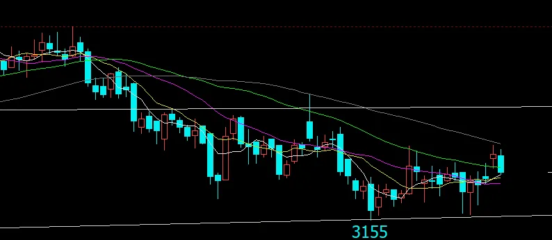 开盘3270,最高3281,最低3237,结算3257。增仓9600手-34点,