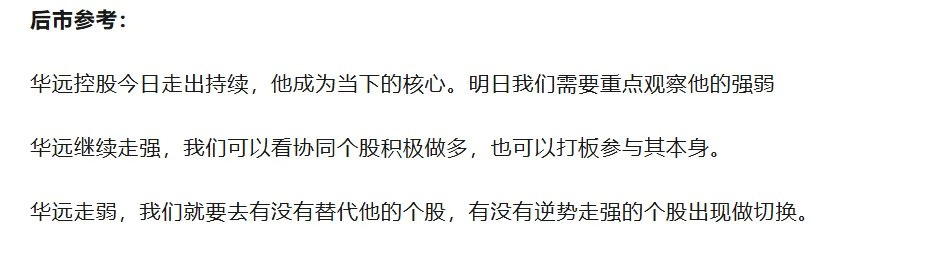 回顾上个交易日行情,短线核心华远控股的快速封板给市场定下了进攻基调。协同个股虽多,但并没有一个强势做多的主体。9点31分,我们可以看到的是华远控股冲击涨停,确认情绪无恙。这个时候的你如果有看到咱们昨日后市参考。那你第一时间选择打板或者参与其他协同个股都是不错的选择。我们圈选择的是协同个股——新朋股份。盘前提前讲解,盘中符合预期开仓。整体盘面,属于全面进攻中,上车即有肉。像我们前天就锁定的锴威特,如果昨日上车也是能吃到大肉的。而其他20cm也没有亏钱效应,当下包容性很好。至于鑫多多的美诺华,我们可以客观的看到是法尔胜与国晟科技的接连走弱。这不可避免地降低鑫粉持股信心。在这种情况下,美诺华还能稳住,还能转为趋势已经算是不错。我没有,但愿意去关注席位溢价的打造情况。美诺华后市支撑看46.8,这个不破不走锁仓没问题。当下华远控股已经成为本轮核心个股,他的强弱将决定短线情绪的强弱。如果你持仓华远,那你只需要盯紧持仓,外面的一切与你关系不大,用0轴做生死线,去做强留弱撤。如果你持仓其他短线个股,华远的强度就是你判断情绪的关键。当华远强时,你看的是持仓股能不能跟上做协同;当华远走弱,你看的是持仓股能否逆势做承接。用这两点做好去弱留强。如果你空仓,华远的博弈依然算是可选项,但连续两日涨停价开,明日如继续这么玩,盈亏比是相对有限的。协同个股的话需要临盘看,但大概也就新朋、锴威特、圣阳股份等带有一定辨识度的潜龙。公众号记得加星标,以免不能及时收到重要消息。