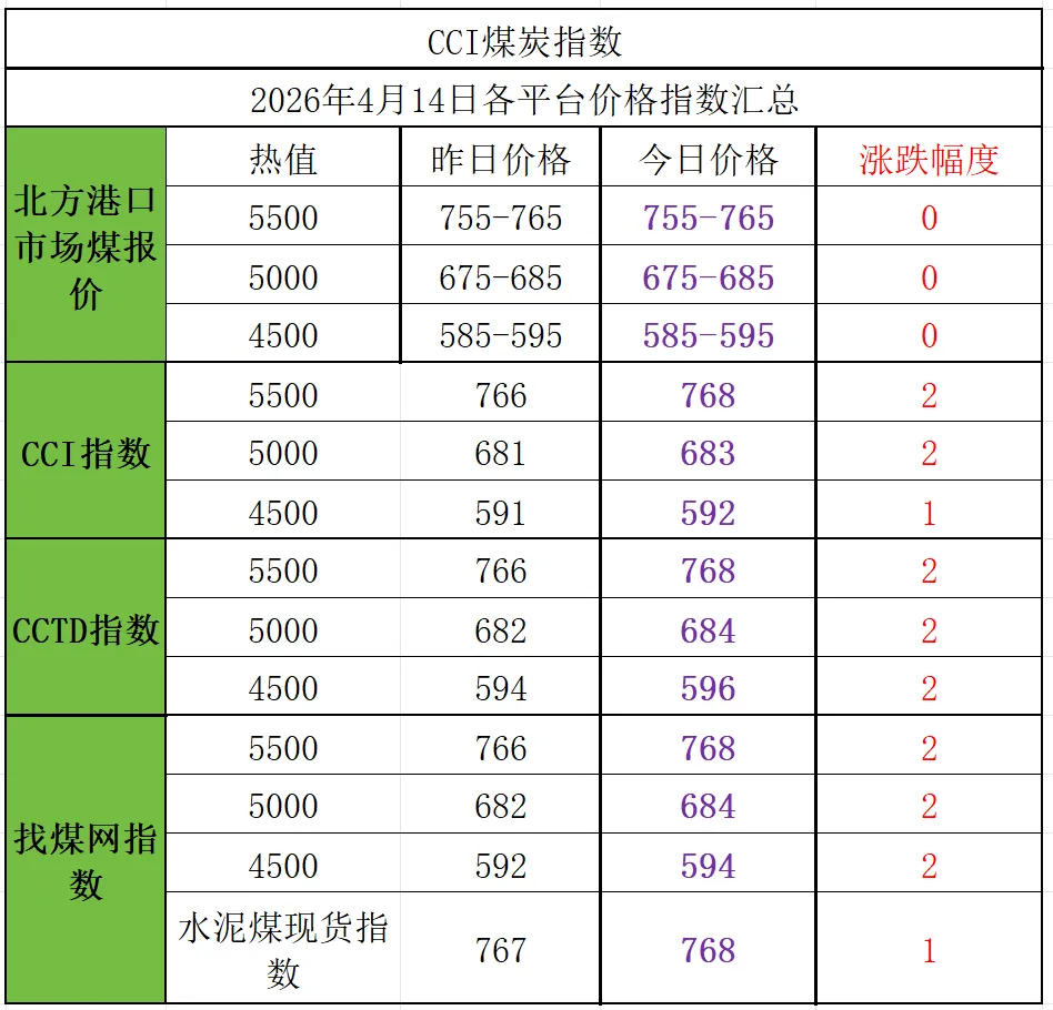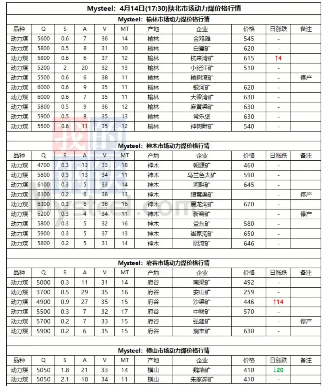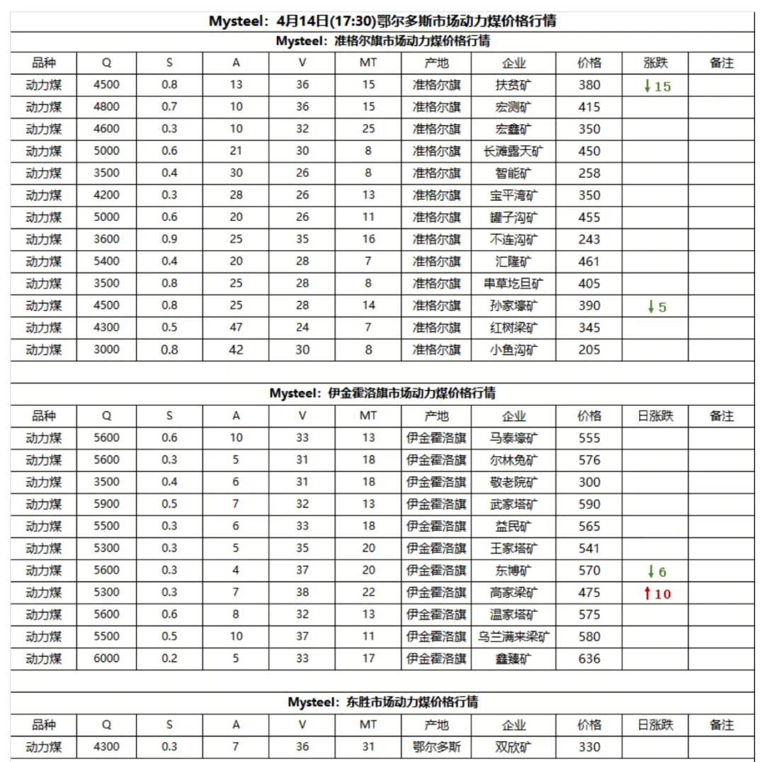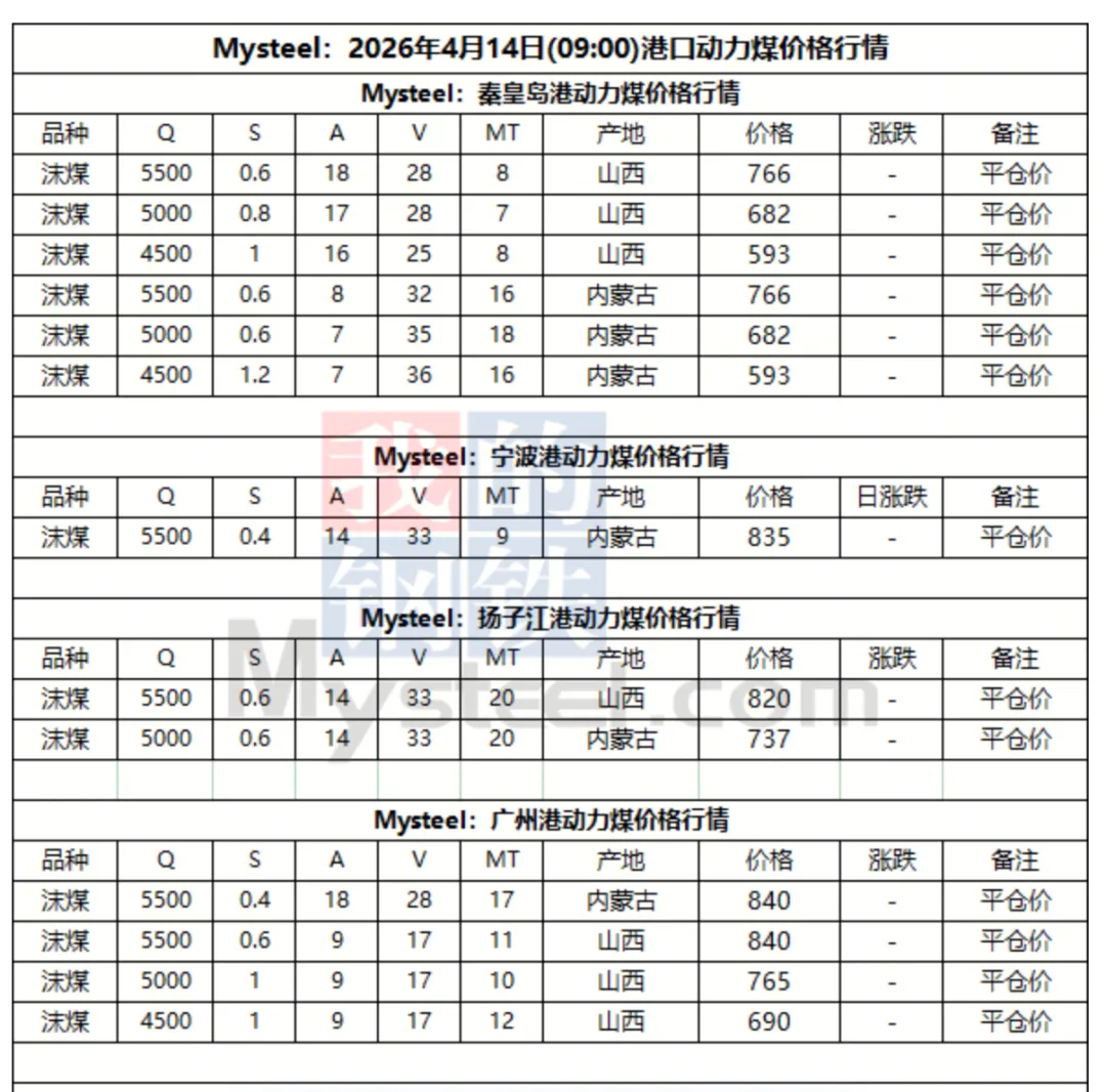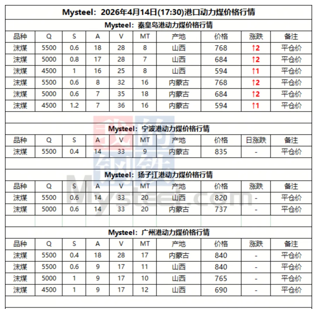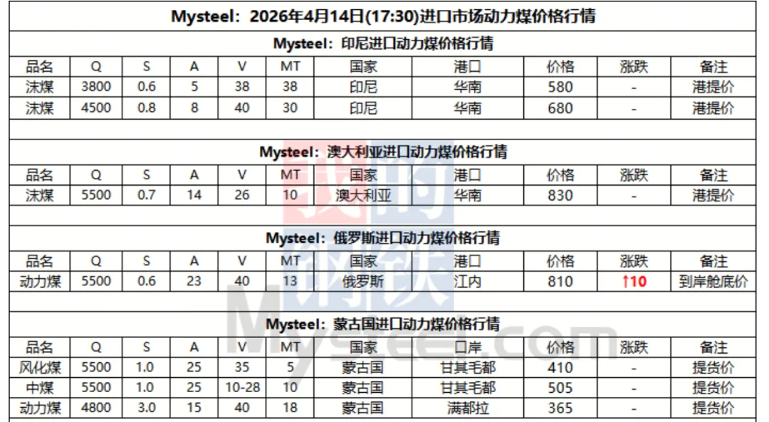 14日进口市场动力煤价格暂稳运行。国际市场上,印尼部分矿区降雨,生产及运输受限叠加其内贸供应比例的提升使得供应不及往年同期;澳大利亚区域性的铁路罢工及检修对昆士兰州港口货源带来的影响余温仍在,运力受限下供应小幅收紧。国内市场上,大秦线春季检修持续推进,北煤南运有所减少,环渤海港口煤炭调入量减少,库存延续去化趋势,内贸煤价报价相对坚挺,部分低卡进口煤仍具有一定的性价比,沿海电厂释放部分刚需采购需求,据悉华南区域电厂Q3800投标价为547元/吨。预计短期内进口煤价将在成本支撑下维持高位震荡,后续重点关注国际供应端变动及内贸煤价变动情况。