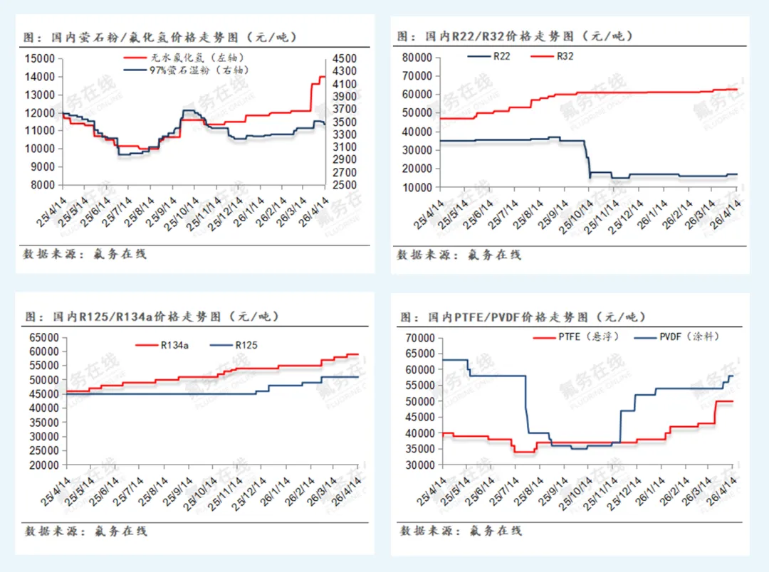 PTFE市场运行良好,企业订单已排至下月。受成本端大幅上涨驱动,前期企业集中发布涨价函以传导压力,市场报价整体走高。下游采购虽对高价持谨慎观望态度、压价情绪较浓,但部分散单成交已达5万元/吨,带动整体成交重心有所上移。加之近期下游补货情绪回升,集中采购行为增多,为企业挺价提供了需求面支撑。当前企业报价随成本波动灵活调整,在成本强力支撑下,预计后市将延续温和上行走势。主流报价参考:悬浮中粒5.0-5.2万元/吨,悬浮细粉5.1-5.3万元/吨,分散树脂5.0-5.4万元/吨,分散乳液3.0-3.2万元/吨。PVDF市场行情持续回暖。受成本端压力传导,企业集中上调报价,部分厂家发布涨价函,各牌号产品价格普涨约15%,实际成交仍需供需博弈。上游原料涨价为企业挺价提供支撑,报价上调带动成交重心上移,散单及各类牌号成交价震荡上行,市场向好态势明确。分品类看,涂料级、制品级价格波动明显,成交重心同步抬升;锂电级受储能需求释放偏缓及下游行业周期影响,涨价空间有限,但后续仍具稳步上行潜力。主流报价参考:涂料级5.8-6.2万元/吨,制品级6.0-6.3万元/吨,锂电级5.7-6.5万元/吨。