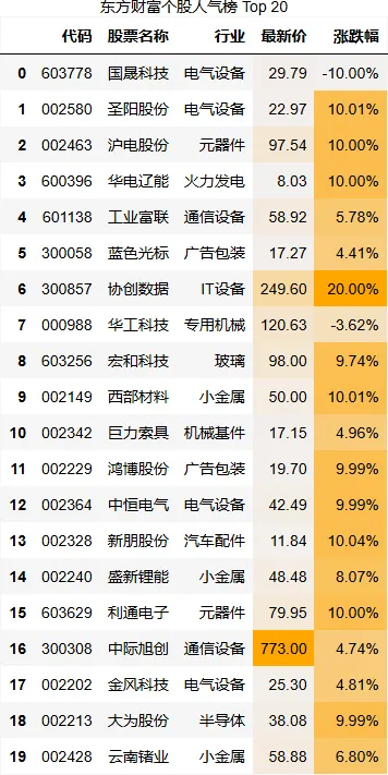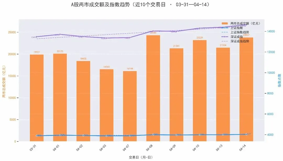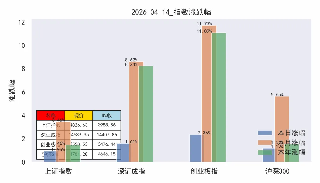 4 月 14 日 A 股放量大涨、全线收红,沪指强势站稳 4000 点整数关口,成长风格全面爆发。沪指收 4026.63 点,涨 0.95%,创阶段新高;深成指涨 1.61%,创业板指飙 2.36%,科创 50 涨 2.17%,均创近期最佳表现。两市成交 2.38 万亿元,较前日放量 2450 亿元,增量资金积极入场。全市场 3700 + 家上涨,1300 - 家下跌,涨停 71 家、跌停仅 10 家,赚钱效应显著提升。板块呈科技爆发、周期调整格局:存储芯片、PCB、能源金属(钴锂)、半导体等全线暴涨,协创数据 20CM 涨停,沪电股份、佰维存储等多股创历史新高;石油、煤炭、汽车整车等传统周期板块逆势走弱。北向资金净流入 86.72 亿元,主力资金加速拥抱科技成长主线,4000 点关口突破有效,市场情绪全面回暖。