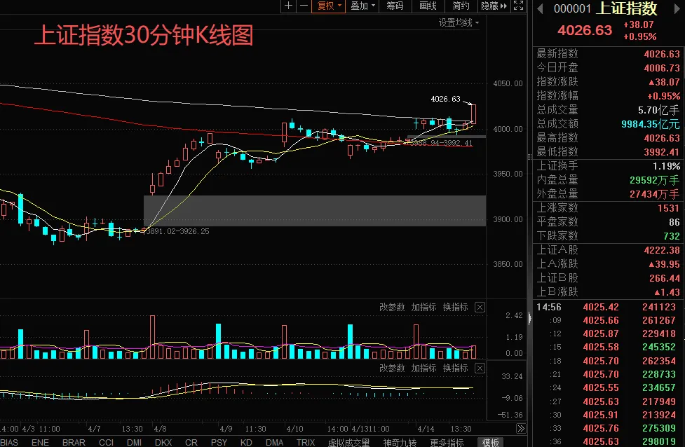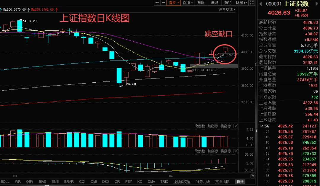 30分钟K线图中,保留跳空缺口,尾盘突破MA250线,压力位变成4042点