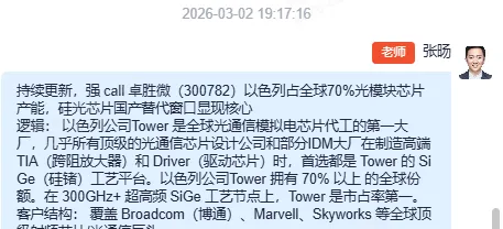 2.复盘前期一些走窄门耕瘦田走暗路的思路,卓胜微、优迅股份两家公司其实就是刚好映射的Tower(这两个埋伏时间也比较长,基本都是一年内最低点纳入观察,然后推荐的,虽然涨幅没有其他的好,但是也胜在稳健,只要是早期建仓基本不会有亏损的体验)