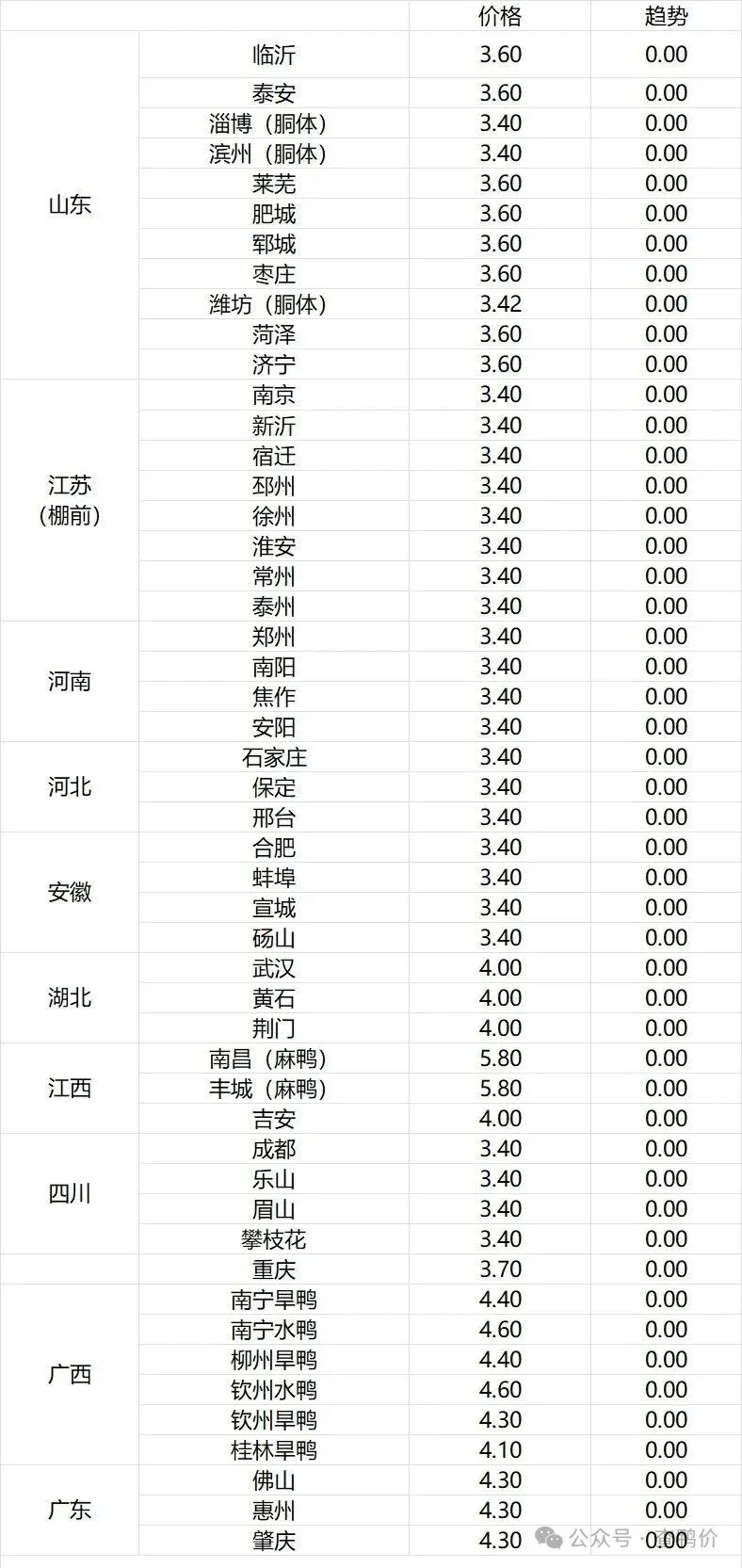 微评:鸭苗报价下跌。(注:南方只报当天价格)博弈加剧,情绪低迷,震荡走低。根据产品、养殖成本及鸭苗现状分析,预计近期鸭苗价格呈稳定为主趋势。种蛋报价稳定。温馨提示:该价格为主流厂家报价,实际销售价格以成交价格为准,价格仅供参考。