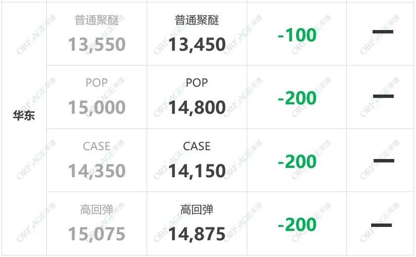 下游板块来看,鞋底原液市场价格弱势运行,华东地区价格报于11,500-16,500元/吨。浆料市场价格大幅推涨。华东干法浆料价格为9,900-10,200元/吨。TPU市场价格偏强运行,华东地区纯BG价格报于22,000-25,000元/吨。鞋材主流报价17,500-21,000元/吨;电线电缆主流报价为22,000-26,000元/吨;薄膜主流报价为18,000-23,000元/吨;手机护套主流报价为17,500-21,000元/吨;气动管主流报价为16,500-20,000元/吨。
