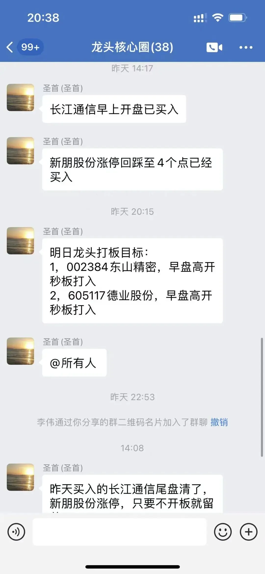 长话短说,讲一下接下来的剧本走向,首先大盘这波回踩3800后非常强势反转,大概率是接下来半年的最低点,除非美伊战争再度爆发升级才会快速跌穿3800往3700看支撑,但是大概率不会出现这种情况。大盘站上4000点后,真正的连板龙头行情很快就会出现。所谓的龙头行情,就是8连板,9连板,10连板的龙头满天飞,和2024年10月11月一样,超级强劲的赚钱效应。因为这波牛市走到现在已经走了一半,赚到钱的该走的已经走了,没赚到钱的也基本套在各种各样的股票上面,这种背景下是最容易刺激市场爆发超级行情,也就是牛市中的加速主升浪。如果经历过2015年牛市的都应该记得当年中国中车,连这种几千亿市值的股也能在短短一个月内涨三四倍,还有当年的暴风影音,连续33个涨停板应该是A股连板记录了。这波牛市会将15年所有最高记录全部打破,我现在就可以断定,毕竟时隔10余年,当下的资金体量和市场规模都完全不是一个档次了,包括庄家的手法以及市场风格都发生了翻天覆地的变化,但是唯一不变的依然是人性和反人性,散户越高越不敢买,但是股票是越高涨得越强,当然这种行情和99%的散户都没有关系。最后简单讲一下近两天的操作,上周四买入的通鼎互联当天大涨次日低开低走小幅止盈出局。本周一也就是昨天开了两个新仓分别是长江通信和新朋股份,长江通信是开盘直接买入,新朋股份是涨停开盘,盘中回踩至4个多点买入成交,今天长江通信在负5左右止损掉,新朋股份开盘快速涨停继续持有。跟我操作必须要全跟,不要只跟一个漏掉一个,这样很容易你吃面我们吃肉,做龙头要有容错率,毕竟没有任何一个人可以做到100%的成功率,我能把成功率做到80%——90%已经超越了全网99.99%的选手,能看懂我的人极少,因为我重来不营销也不会做互联网,不会玩那些花里胡哨的东西,来到这个市场目的只有一个就是为了赚钱,愿意带一群铁粉完全也是出自于内心的善良,部分人觉得我收这几千块很多,我可以很负责地告诉大家,很多时候我一天的账户收益比我十年收的服务费都要多。(全新的操作模式,每晚提前给出次日目标股,开盘直接买入无需思考,经过近20年的不断总结完善,从以前的半路追,到打板,到现在盘前提前确认,开盘直接买入,每日单吊一到两个,成功率接近90%,全网最强龙头选手没有之一,秒杀抖音99.99%假大V。)核心群订阅时长:(年度收益不足一倍全额退款)