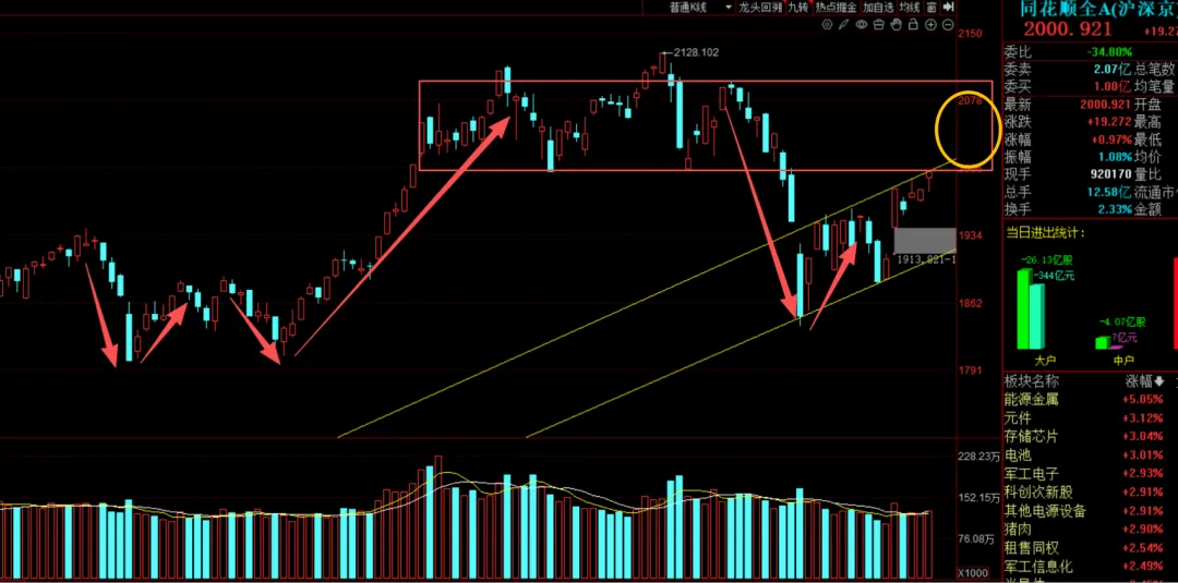 但上午上午放量其实力度是偏弱的,下午第一个小时出现明显放量,更多是杀跌抛盘,尾盘最后 30 分钟,金融、锂电池、科技方向资金回流,合力将大盘推升至光头阳线收盘,直接站上了前期压力位。