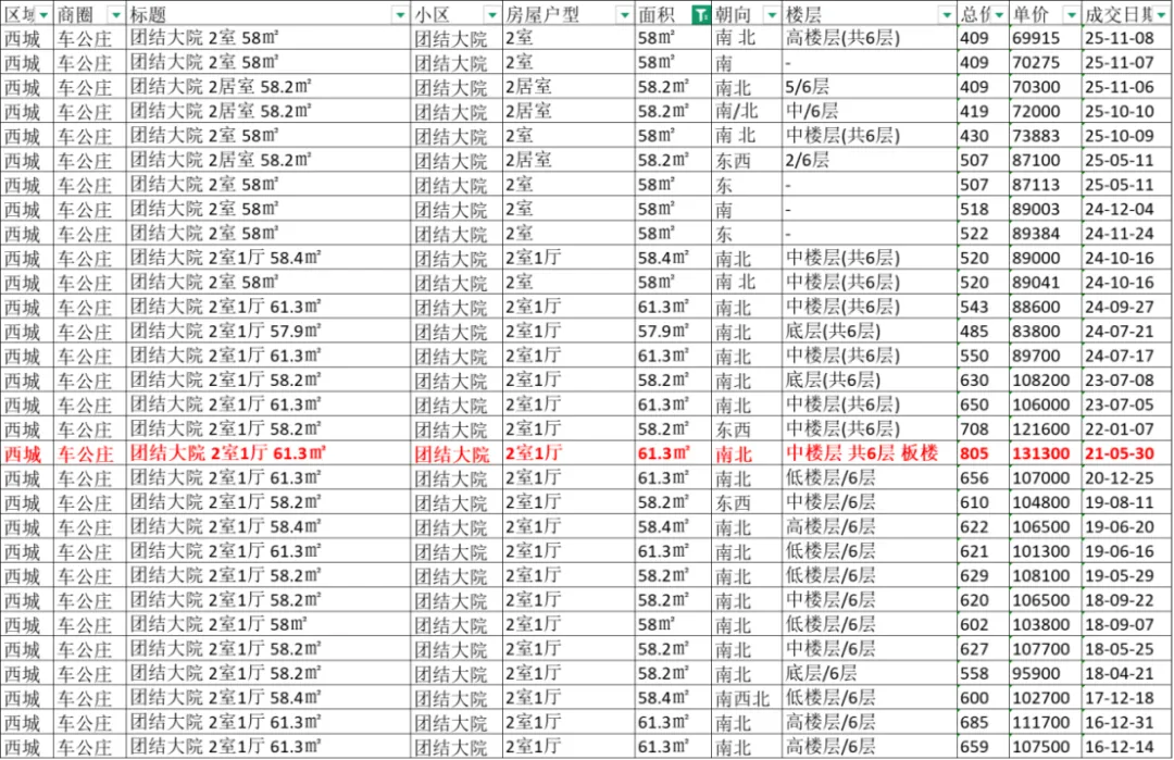 西城区车公庄片区的北礼士路北区、团结大院、进步巷,区位、房龄、户型、学区都高度相近,同属老公房社区,这一轮房价调整也走出了几乎一致的大幅下跌行情,很有代表性。