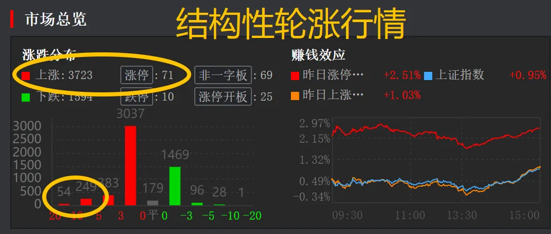 收盘两市上涨3723家,涨亭71家,涨幅大于5%的300余家;