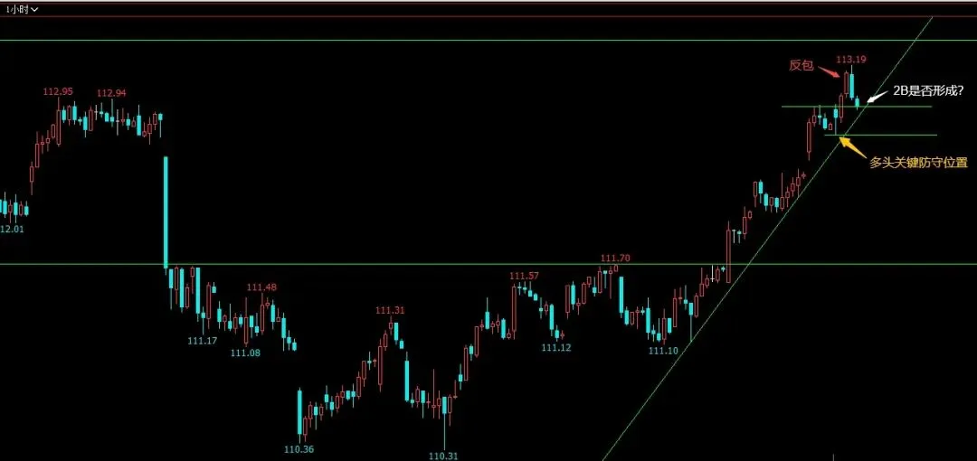 3、多头关键防守位置。112.67是多头的关键防守位置,若此位置确认跌破,则构成波段多单右侧止盈的最后出场点。