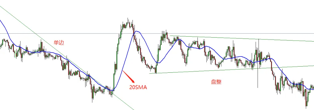 - 均线:如果市场价格分布在均线的一侧,说明市场在单边趋势中;如果市场价格在均线上下来回波动,说明市场处于盘整趋势。