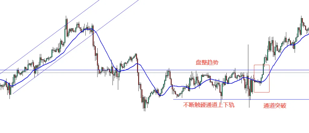 - 通道:市场价格在趋势通道内来回波动,在通道上下轨不断反弹,表示市场处于盘整趋势,如果市场价格突破通道,表示市场将进入单边趋势。