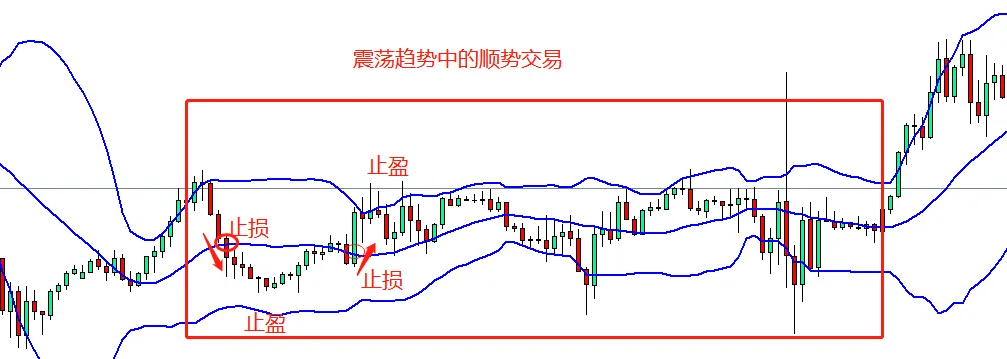当然更保险的方式是顺势交易,中线作为重要的支撑和阻力水平。如下图所示,借助布林带指标,也可以在震荡趋势中做顺势交易。