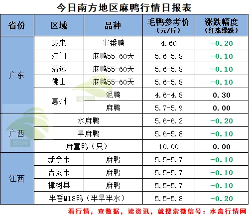 (1)广西地区:旱鸭报价4.00-4.30元/斤,各地区报价下跌1-2毛水鸭报价4.20元/斤,各地区报价下跌5毛