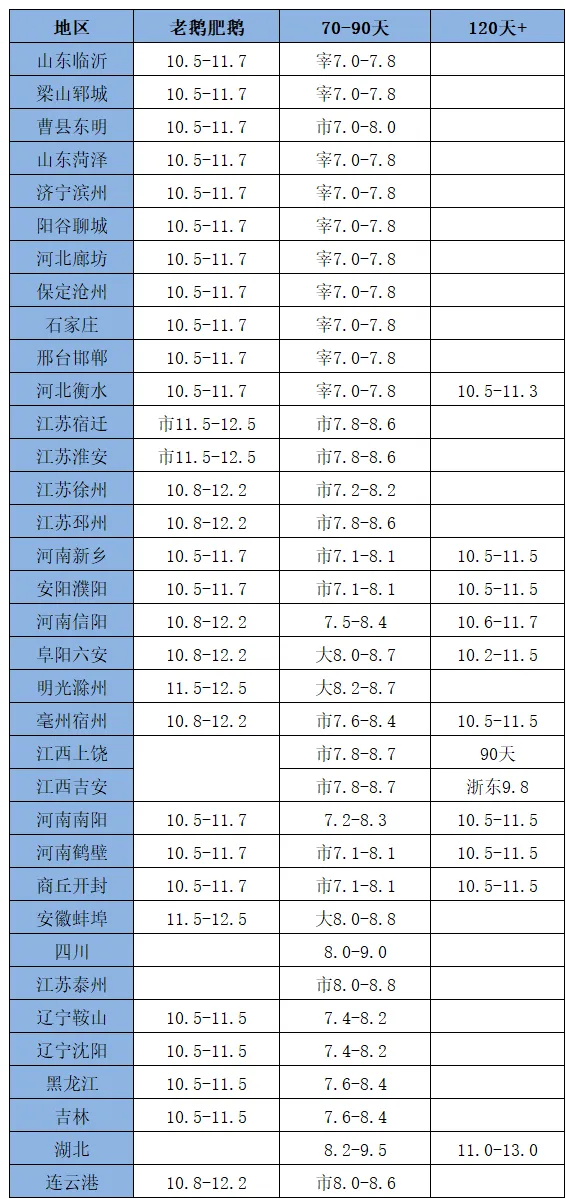1、今日主产区毛鸭价格明细表