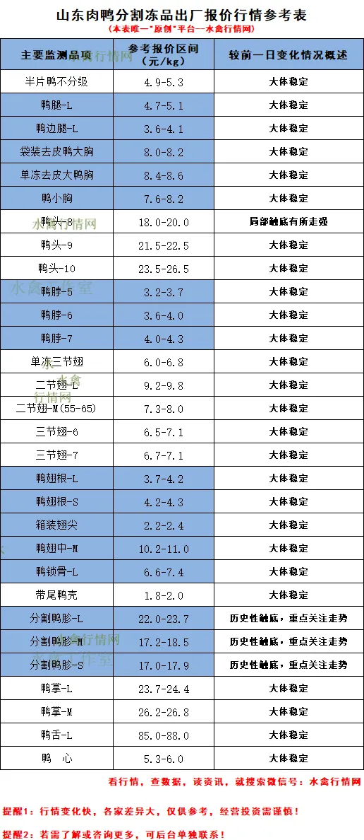 b、今日副产类:报价总体运行弱稳,主要表现为局部样本点单品量大议价或有优惠政策;主要单品包括鸭头8、二节翅L/M、鸭掌L、鸭脖6、鸭胗类、翅中M。多点针对部分单品甩价清库后,报价开始有所反弹,如8头。