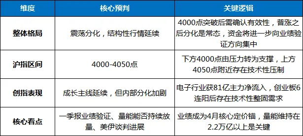 预判结论:今日沪指重返4000点,是A股对地缘扰动逐步"脱敏"、国内景气主线确认的共同结果。分析人士认为,随着一季报业绩预告密集披露期开启,市场开始对景气个股给予积极定价,外部扰动并未改变市场对景气方向的追逐,市场将回归基本面,中国股市有望重拾上升趋势。展望明日,预计市场延续震荡分化、结构性行情格局,一季报景气方向(AI算力/存储芯片、锂电产业链)仍是核心主线,地产、军工等方向或有轮动机会,油气板块短期仍有反复。