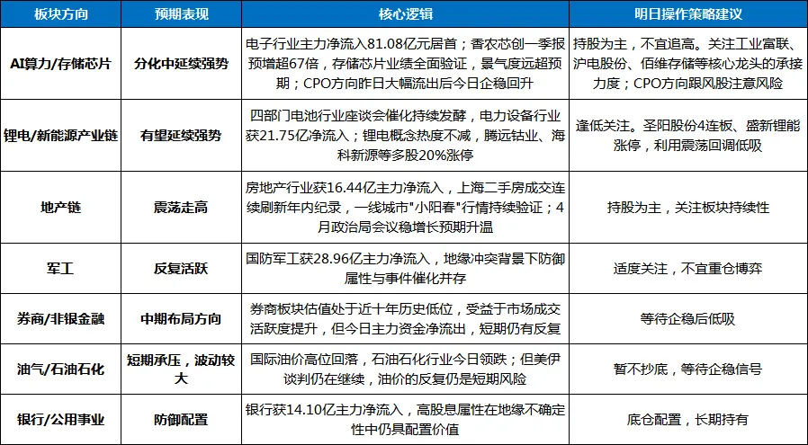 综合今日资金流向与机构观点,一季报景气三大主线(AI算力链、锂电产业链、资源品涨价链)仍是短期核心。明日操作中应坚持: