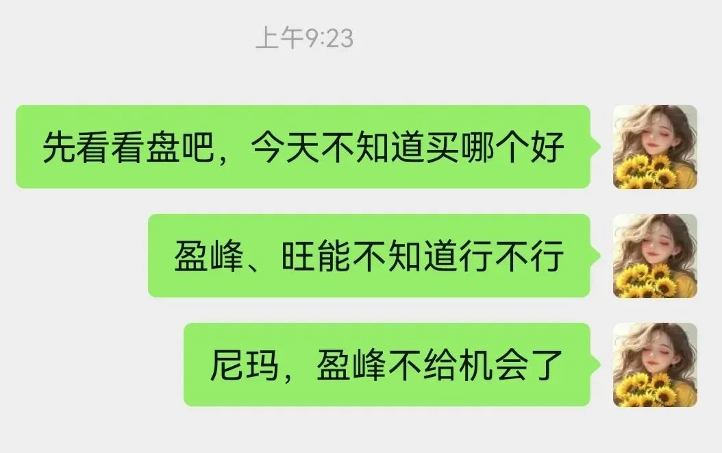 盈峰,昨天给了盈峰半仓,结果尾盘都撤离了,今天集合竞价看着盈峰每一分每一秒都在涨价,我的胸闷啊,我心疼啊,肉就这么飞了!
