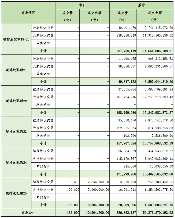 今日全国碳排放权交易市场成交总量132,000吨,成交总额10,504,700.00元,成交均价79.58元/吨。截至今日,全国碳排放权交易市场累计成交总量886,382,187吨,累计成交总额59,276,270,192.92元。