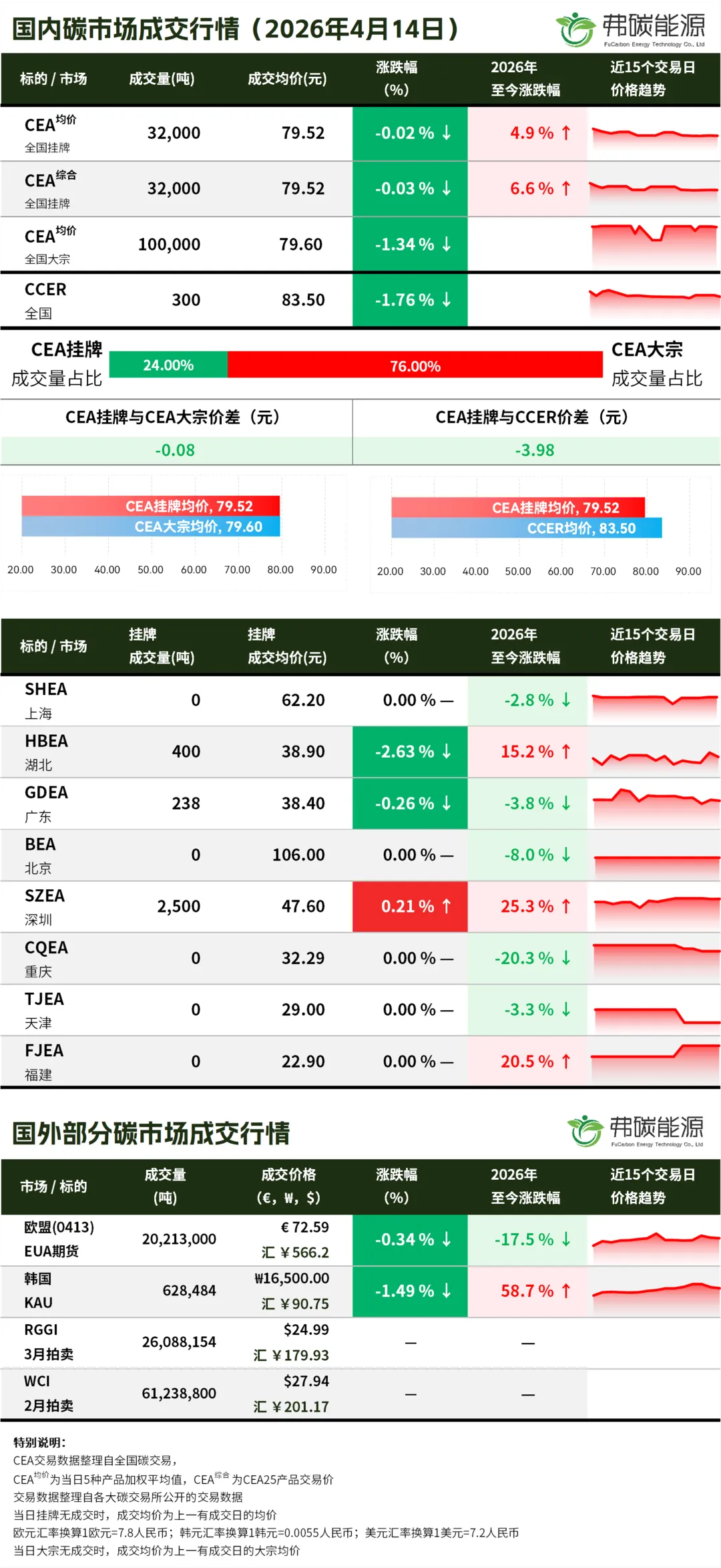 >碳市行情26.4.14 | CEA挂牌成交3.2万吨,成交均价下跌...